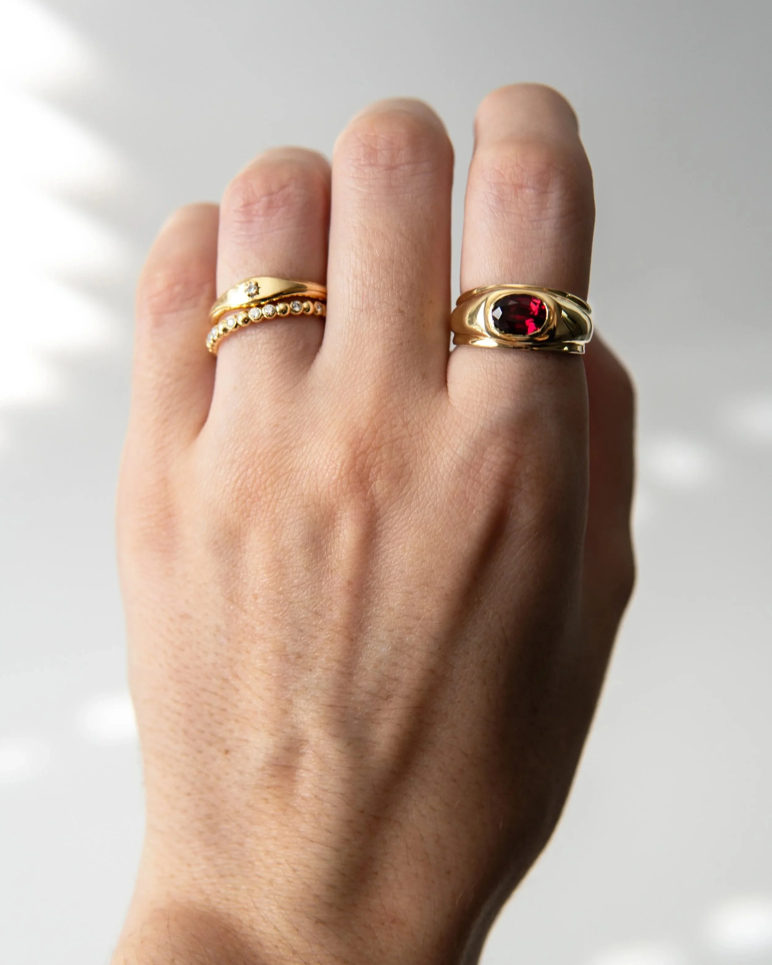 Each piece in this collection was created as a reminder to let in the light. After my dad’s passing, I found it helpful to focus my attention on the little joys in order to keep my spirits up. With that sentiment, I designed this collection using symbols of love and transformation as a message of positivity with each wear. Woven within are themes of nature and spirituality that bring me joy and remind me of my dad.